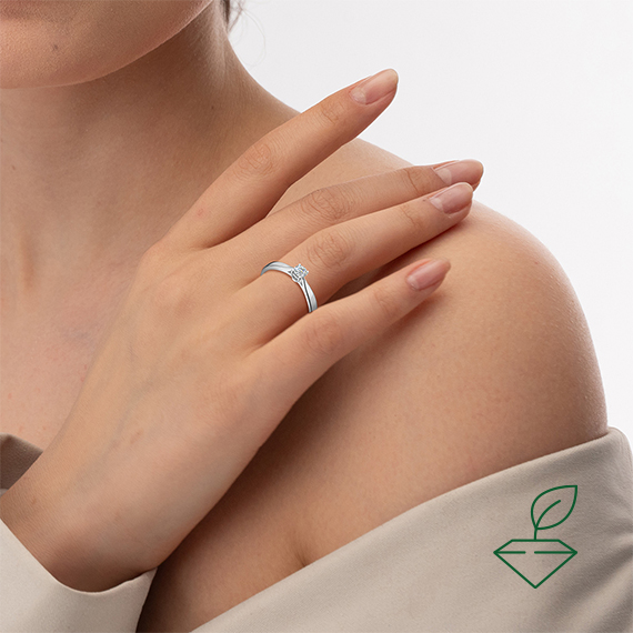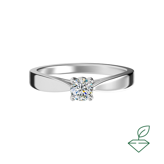 Кольцо из белого золота 585 пробы с выращенным бриллиантом. Характеристики вставки: 1 выращенный бриллиант Кр-57 массой от 0,12 карата 2/4А, диаметром 3,2 мм. Кольцо покрыто родием, для защиты металла от внешних воздействий и придания ему зеркального блеска. Отлично подойдет в качестве помолвочного кольца и как украшение на каждый день.