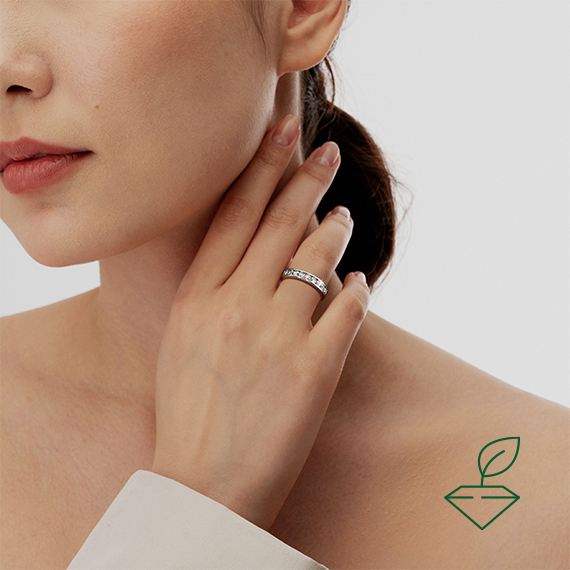 Кольцо дорожка из белого золота 585 пробы с выращенными бриллиантами. Характеристики вставок: 9 выращенных бриллиантов Кр-57 общей массой от 0,312 карата 2/4А, диаметром 2,1 мм каждый Кольцо покрыто родием, для защиты металла от внешних воздействий и придания ему зеркального блеска. Отлично подойдет в качестве обручального кольца и как украшение на каждый день.