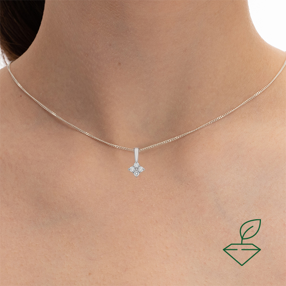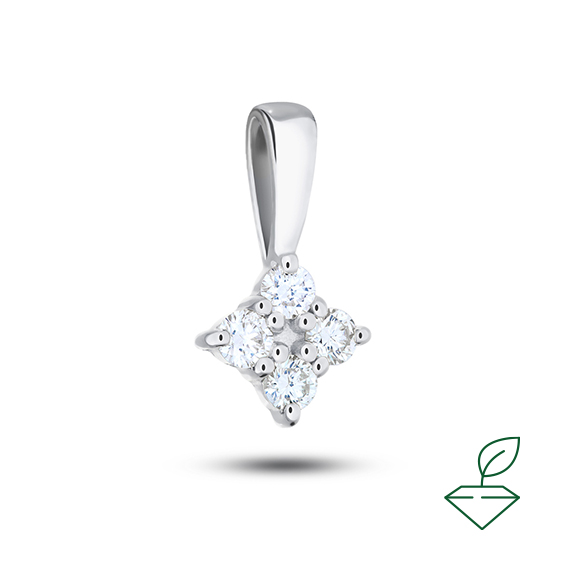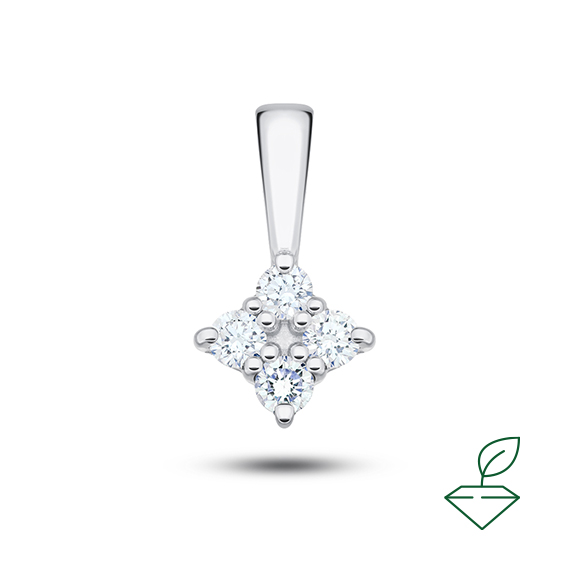 Подвеска из белого золота 585 пробы с выращенными бриллиантами. Характеристики вставок: 4 выращенных бриллианта Кр-57 общей массой от 0,124 карата 2/4А, диаметром 2,0 мм. Подвеска покрыта родием, для защиты металла от внешних воздействий и придания ему зеркального блеска. Отлично подойдет как на торжественный выход, так и на каждый день.