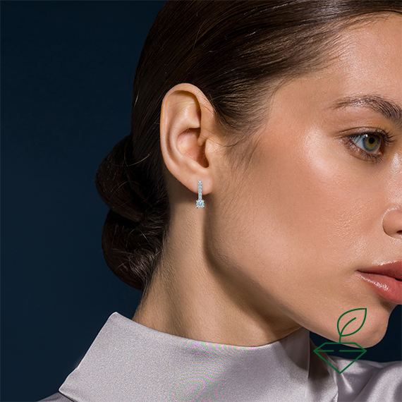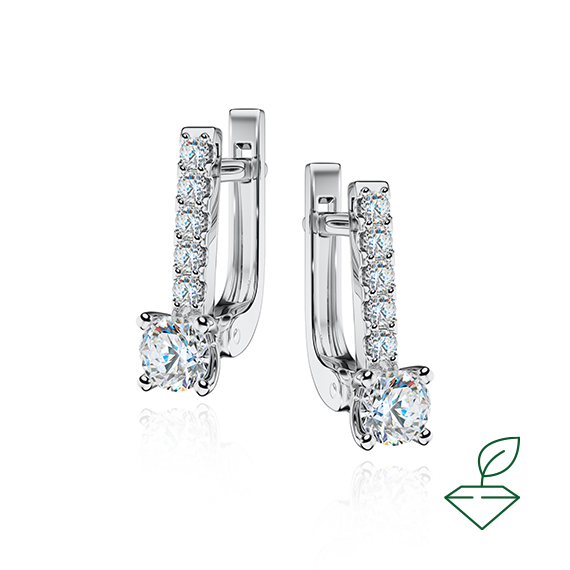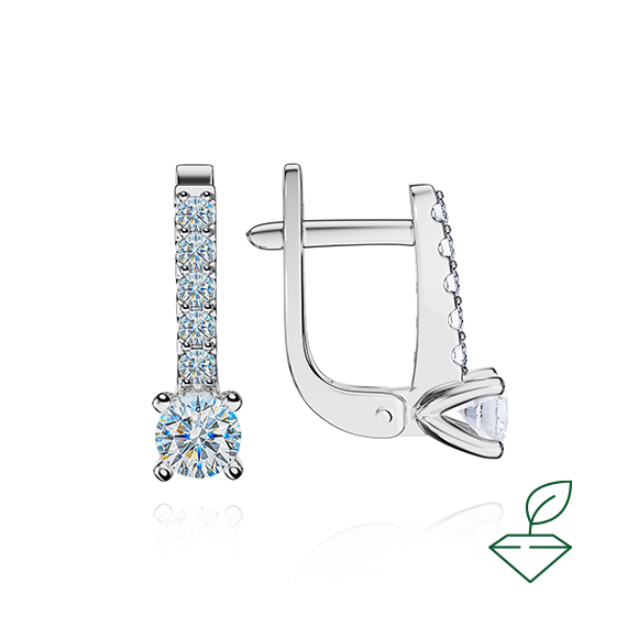 Серьги из белого золота 585 пробы с выращенными бриллиантами. Характеристики вставок: 2 выращенных бриллианта Кр-57 общей массой от 0,5 карата 2/4А, диаметром 4,0 мм. 10 выращенных бриллиантов Кр-57 общей массой от 0,14 карата 2/4А, диаметром 1,5 мм. Серьги покрыты родием, для защиты металла от внешних воздействий и придания ему зеркального блеска. Сережки отлично подойдут как на торжественный выход, так и на каждый день.
