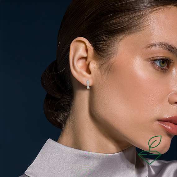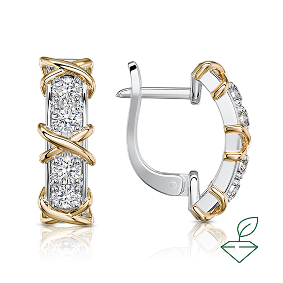 Оригинальные серьги из комбинированного золота 585 пробы с выращенными бриллиантами. Характеристики вставок: 8 выращенных бриллиантов Кр-57, общим весом от 0,540 карата 2/4А, диаметр каждого бриллианта 2,6 мм.